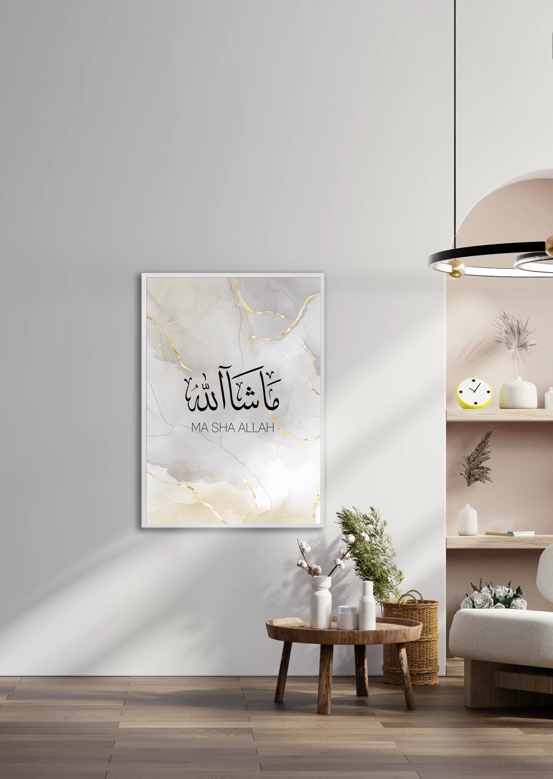 The second poster presents the term “Mashallah” in graceful lettering against the serene grey backdrop. The golden or white script expresses a sense of admiration and acknowledgment of divine blessings. This phrase, meaning “What Allah has willed has happened” or “God has willed it,” unfolds as an elegant testament to gratitude and recognition.