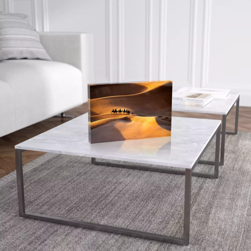 Crafted with meticulous detail, the glass bloc technique beautifully encapsulates the intricacies of the Old Medina’s architecture, the labyrinthine alleyways, and the lively market stalls. The transparent medium allows the warm tones of the ancient walls to shine through, creating a captivating visual interplay that mirrors the authentic charm of this historic district.